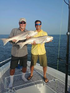 Redfish: Also known as red drum, these copper-colored beauties are a staple of inshore fishing. They're often found tailing in shallow water, rooting for crabs and shrimp. Redfish are bulldogs of the flats, known for their powerful runs and ability to strip line from your reel. We typically catch them in the 20-30 inch range, but trophy-sized "bull reds" over 40 inches are not uncommon. Fall is the best time for big schools of redfish, but we target them successfully all year.